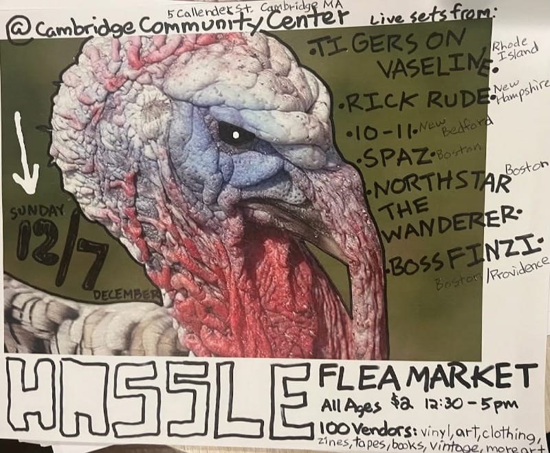 Creature here, my new noise/punk band Tigers on Vaseline is playing the hassleflea in Cambridge, MA on Sunday December 7th. It's a really cool independent art/makers mart/ flea market run by New England legend Dan Shea and tons of fun bands playing in the basement, so check it out if you're around. Dan also DJs as part of repeat offenders and I just saw a cool soul/r&b set from them at myrtle in east Providence. Love that dude.