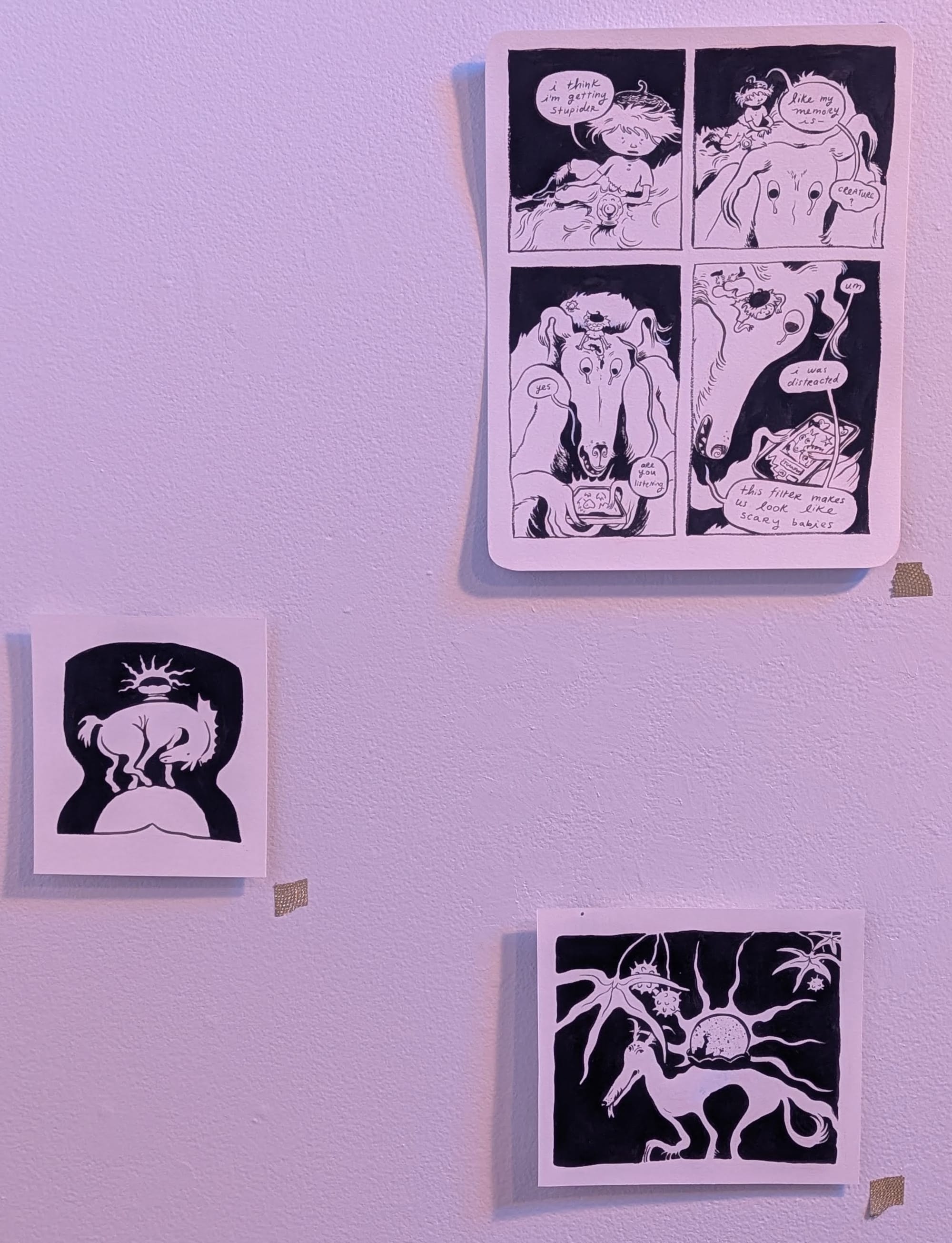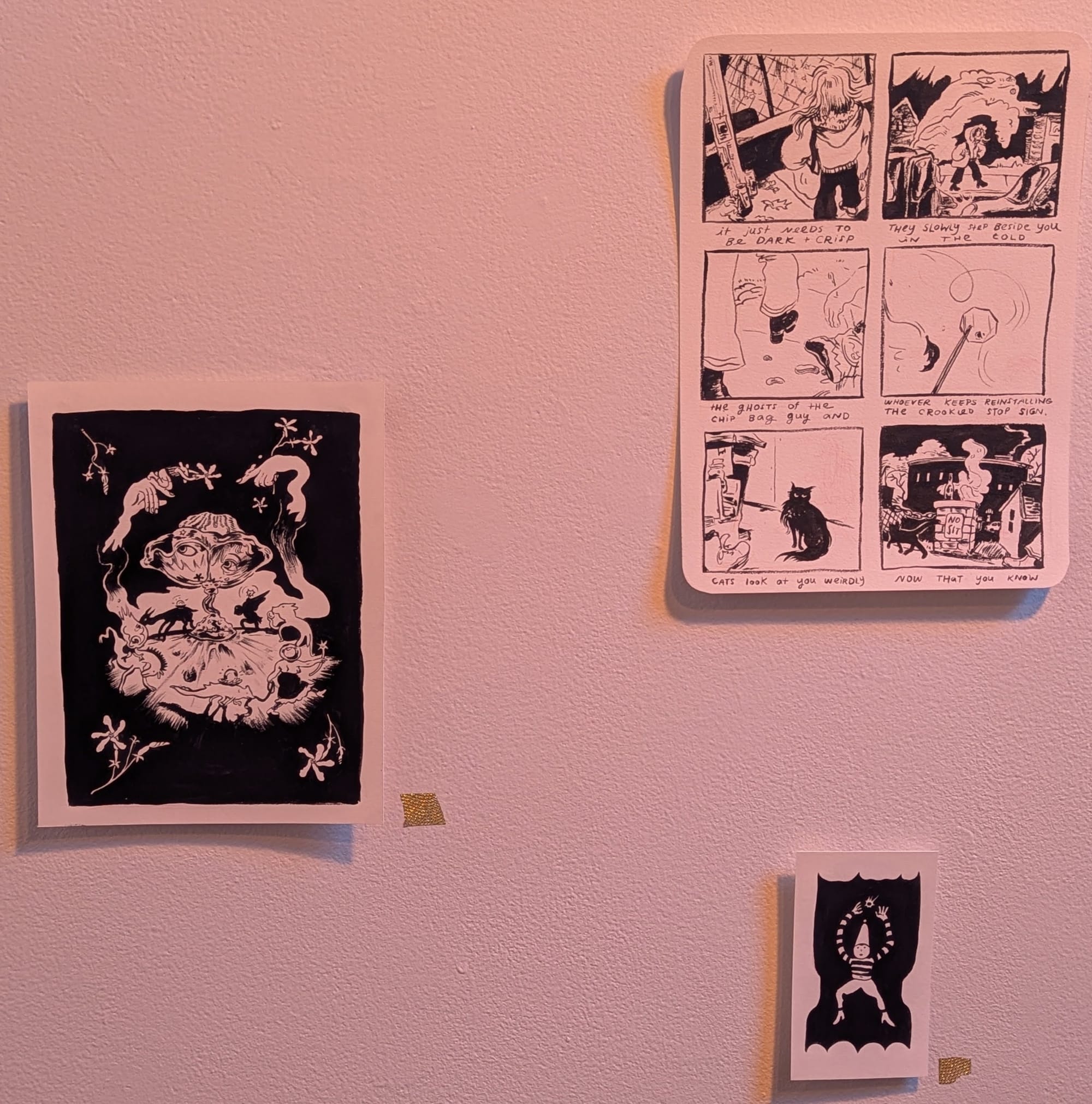 For the second half of the double feature, I wanted to share some photos I took of the December exhibit at the speedshop. It was by artist Maddie Dennis and was called Creatures of the Half Light. I really like her style, particularly the ink drawings and those little weird egg dudes. Her style is so sick. Check it out.