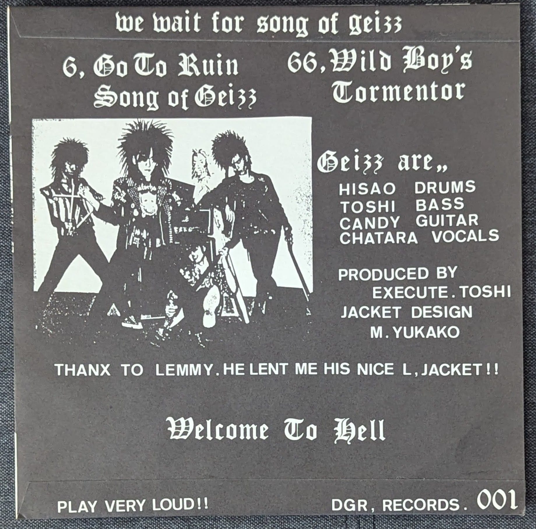 Second up is a Japanese metal punk/hardcore record from 1985 I picked up at WFMU record fair in the fall. We Wait For Song of Geizz by Geizz. They recorded this sole record, but members went on to play in The Execute, Final Bombs, Last Bombs and more. To the music, this is great UK hardcore (think Discharge or Chaos UK), Motorhead and the almighty GISM. While the musicianship and recording may not be as professional as GISM, its more than made up for with the spirit and raw sounds on this one. My favorite thing about the record though is that they thanked Lemmy (from the Execute) for letting them borrow his "nice" leather jacket for the photo shoot. Love it