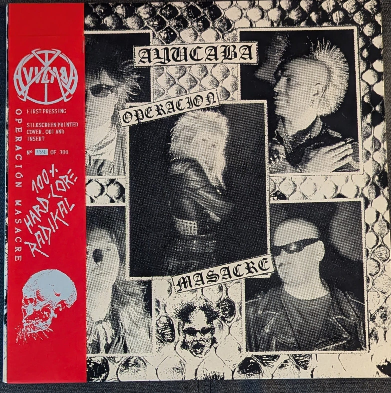 First up is a recent LP by Ayucaba from Buenos Aires, Argentina called Operacion Masacre. Nice raw metal/dbeat, on the English Dogs tip which isn't normally my bag, but these simple riffs, with shredding guitar and some really messed up (in the best way) sounding vocals push this into a keeper. Plus the sick artwork on the immaculately silkscreened package with a massive poster/lyric sheet are worth the price of admission alone.