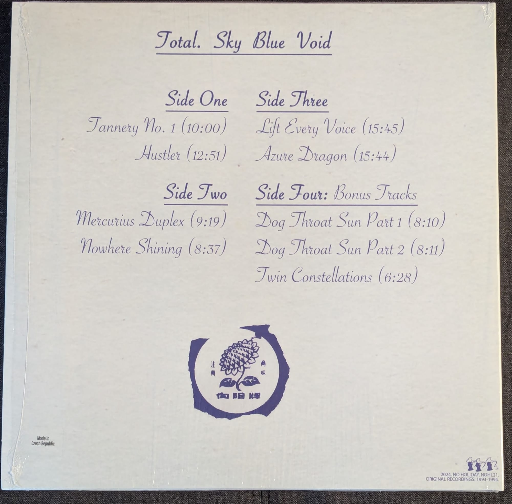 Next up is a reissue of what the label calls the "zoner of zoners" - Total's Sky Blue Void. Total is Matthew Bower from Skullflower, and this record is from 1994 and recorded the same year as Skullflower's monumental Last Shot at Heaven. Remastered for vinyl and sounding great, this is total late night stoned and stare into the ceiling music. I can see how this was created during the same time period as Last Shot at Heaven. Solo drones into the sky blue void - listen to this when you want to disappear for awhile