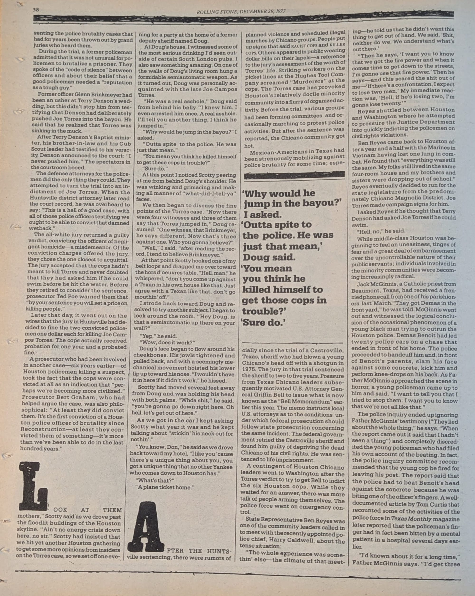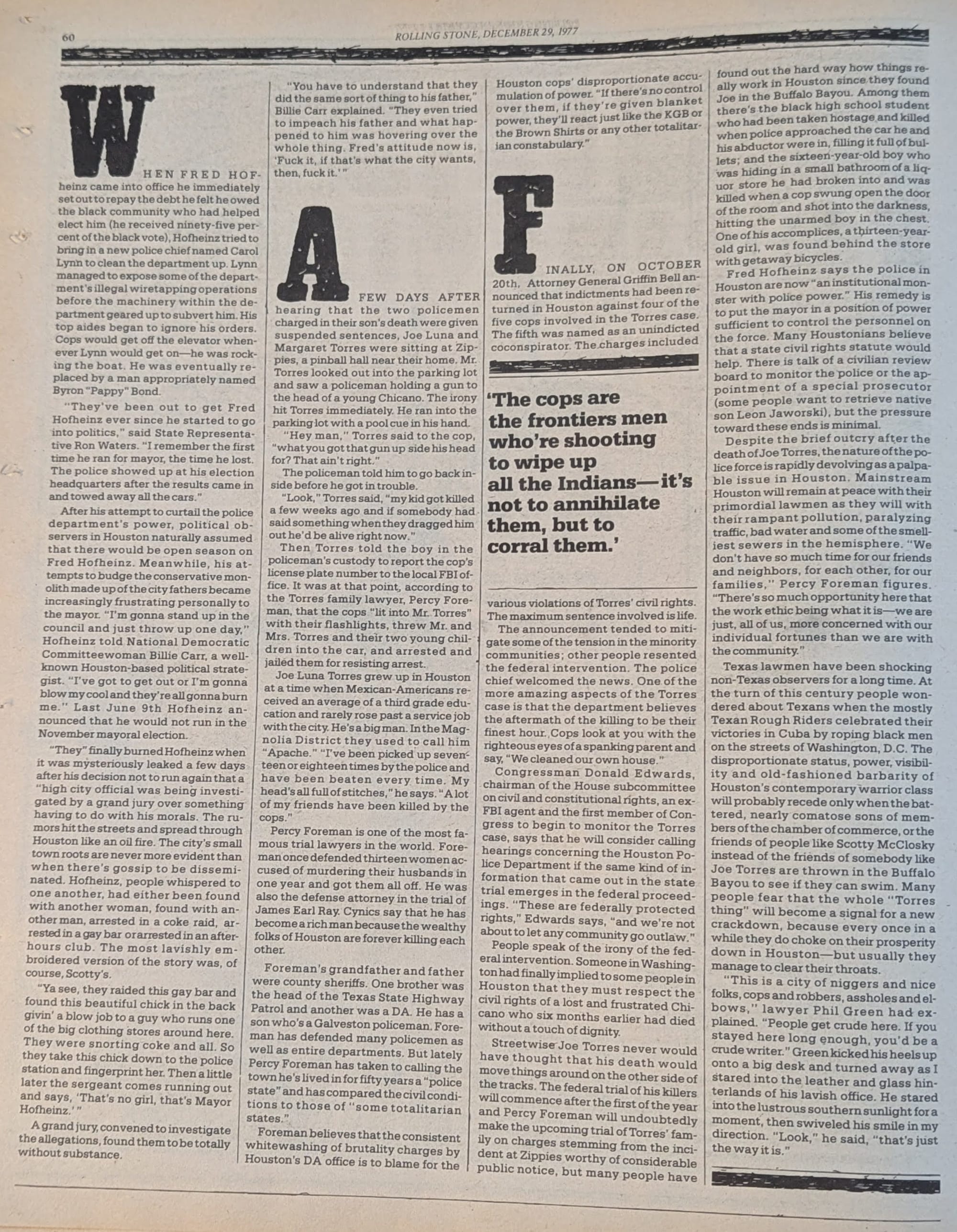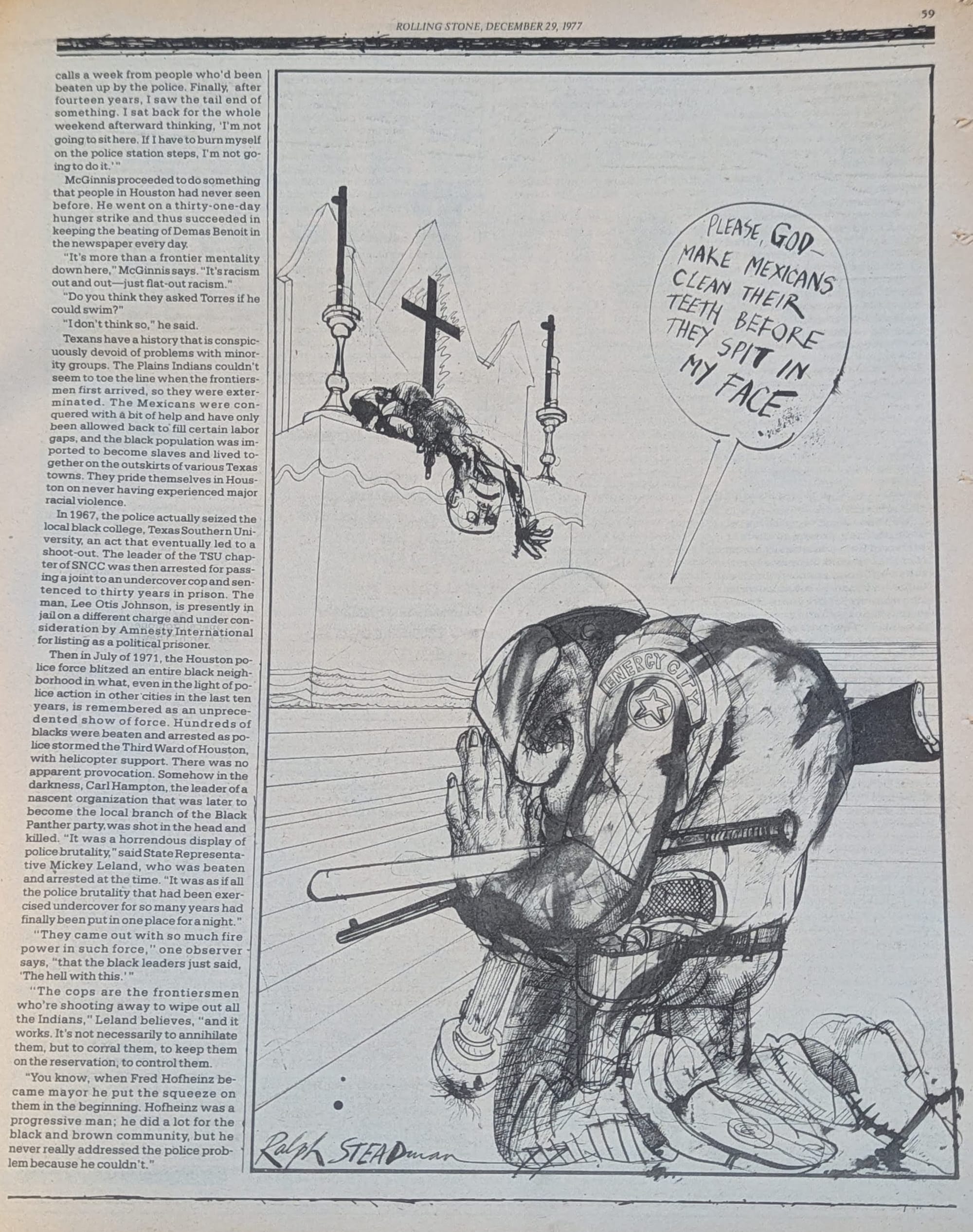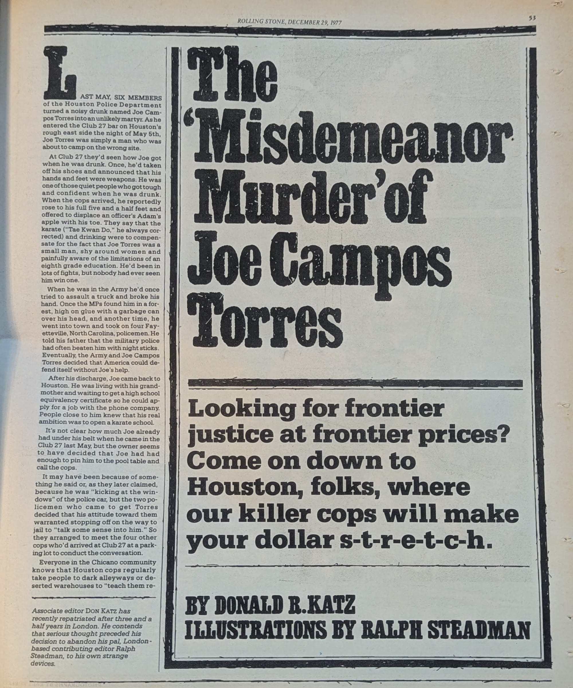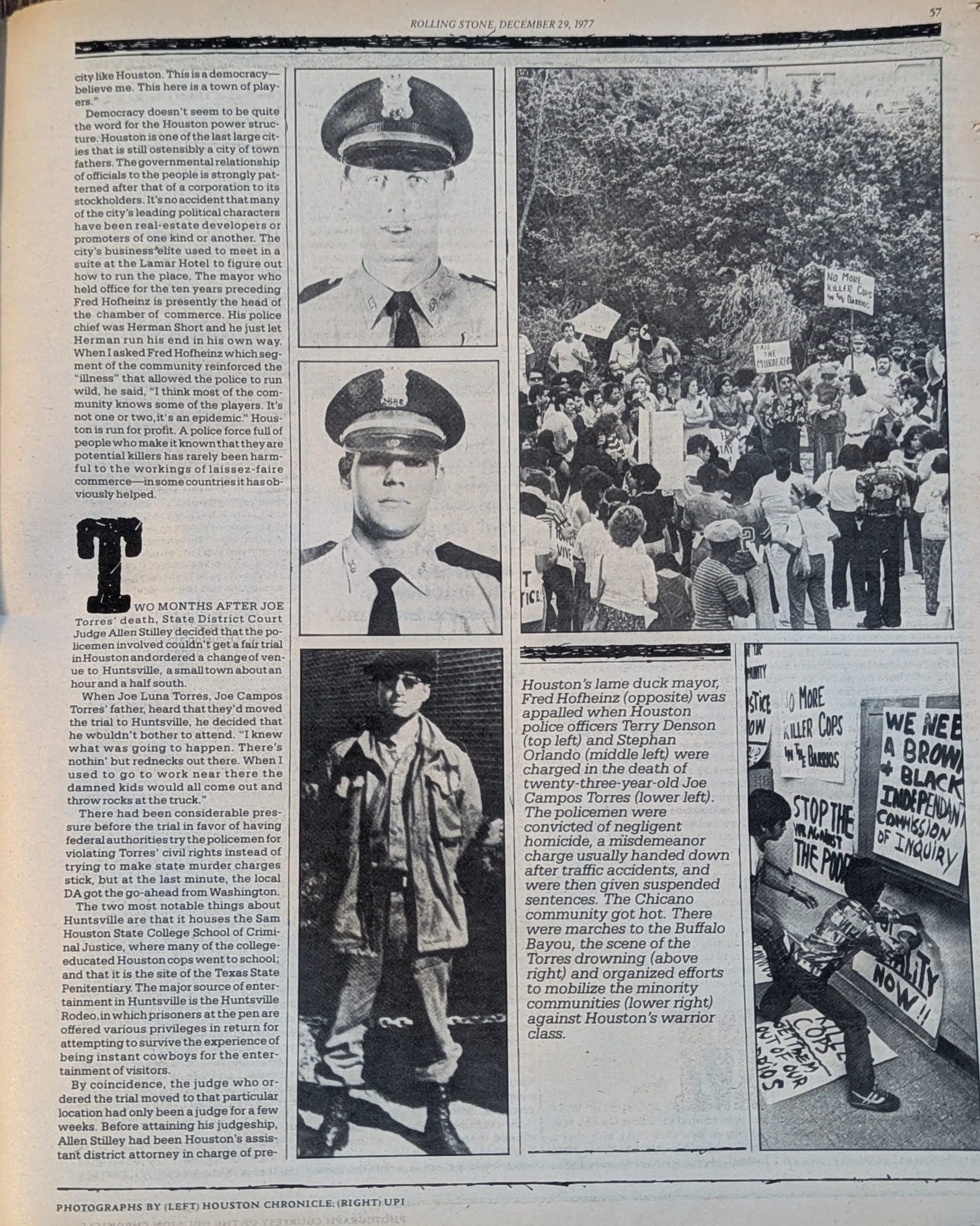 We saw this sign referencing the classic texas punk band AK-47's song The Badge Means You Suck at the protest. Such a banger, but based on the reality of american racist violence. The next day we stopped at an antiques/junk shop and I found an old issue of Rolling Stone with an article about the murder of Joe Torres, which was one of the violent killings that inspired the song. Really cool in-depth article about the killer Houston cops If you've ever wanted to know more about what The Dicks were actually singing about in Hate the Police (or MDC, Really Red, etc.. etc...) Stay pissed forever about this shit, which is the same old fight as now. Keep on keepin' on