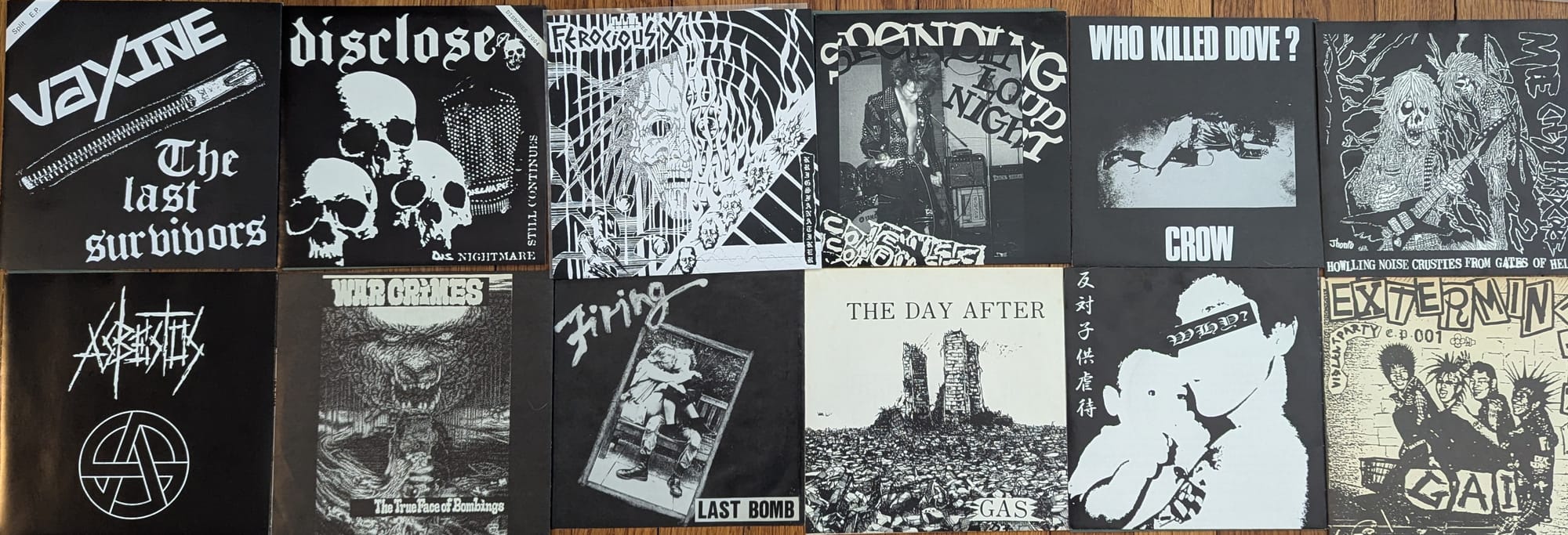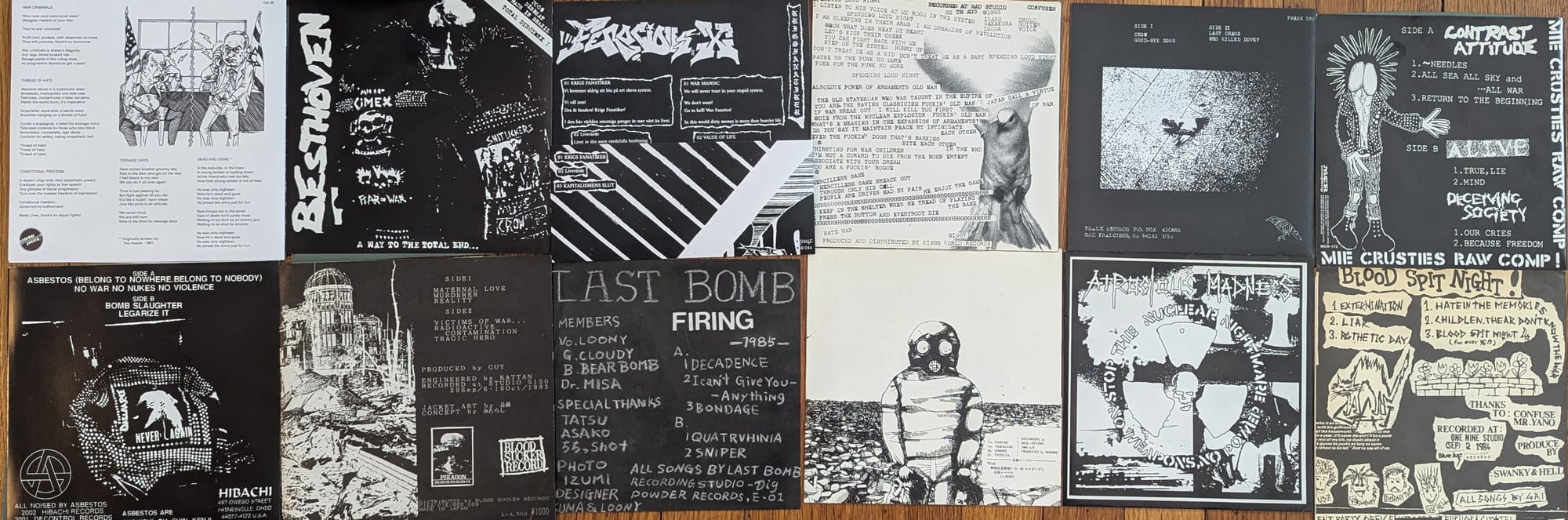As if I don't talk about (chaos non) music(a) enough, here's the soundtrack to this week's issue, blasting out the anti-war noise (and discharge, always discharge, but I think these bands all knew that): Vaxine/Last Survivors split, Disclose/Besthoven split, Ferocious X flexi, Confuse - Spending Loud Night, Crow - Who Killed Dove?, Mie-City Hardcore 2 comp, Asebestos - s/t, War Crimes - The True Face of Bombings (underrated ripper for sure), Last Bomb - Firing, Gas - The Day After flexi, Atrocious Madness/Why? split (don't sleep on that Why? side - killer electro drum machine dbeat madness), and Gai - Extermination flexi.