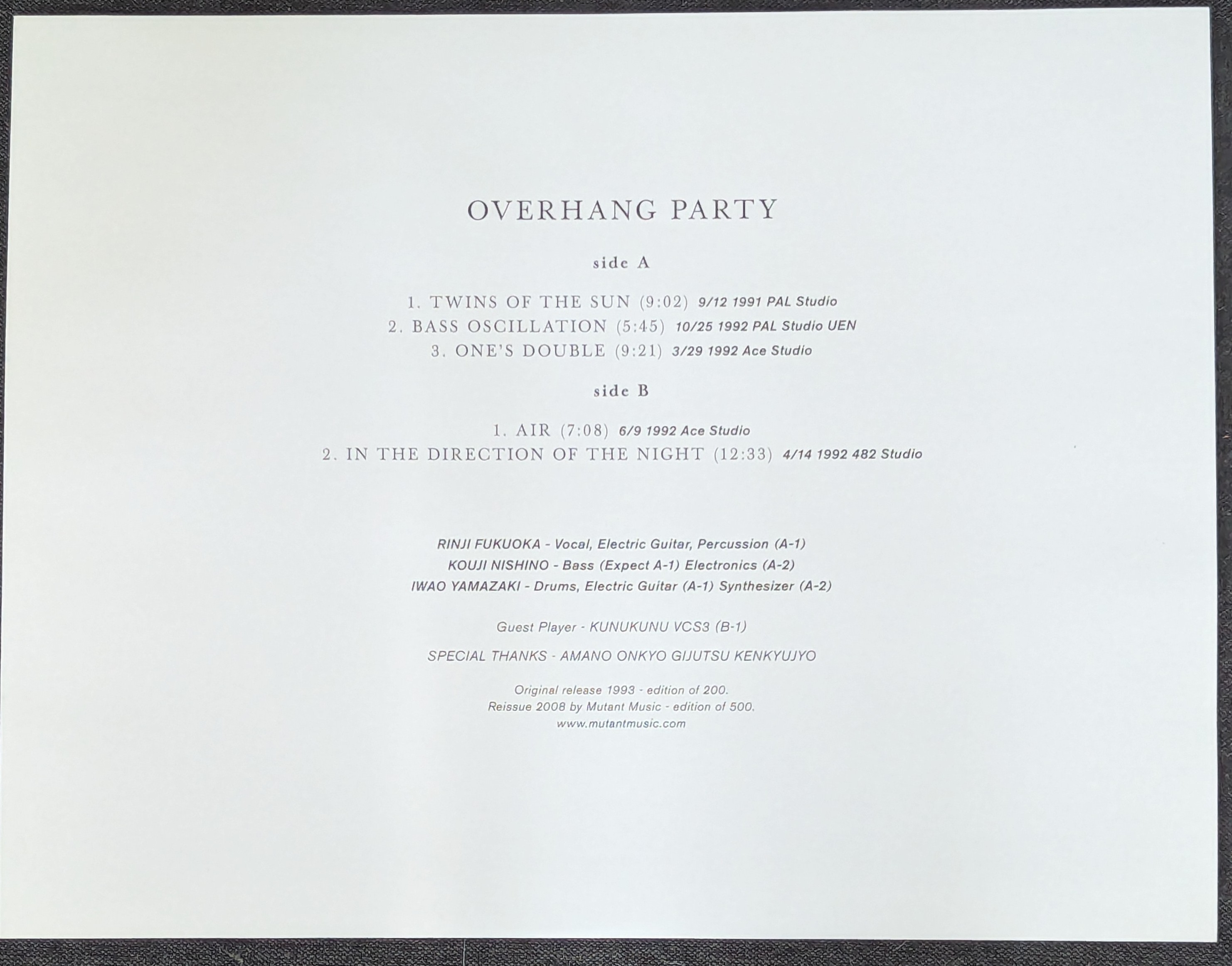 Overhang Party’s first s/t LP was self released in a mere 200 copies in 1993 on guitarist Fukuoka Rinji’s Pataphysique Records, which still operates to today releasing records by his latest band Majutsu no Niwa (see link). There was a reissue sometime in the 2000s that seems to still be affordable despite being limited to 500 copies. The minimalist white on white aesthetic is striking as is the music, a psychedelic noise rock album that is also surprisingly dream-like with its long songs and droney synthesizer, meeting fuzzed out psychedelic guitar. A hell of an opening statement.