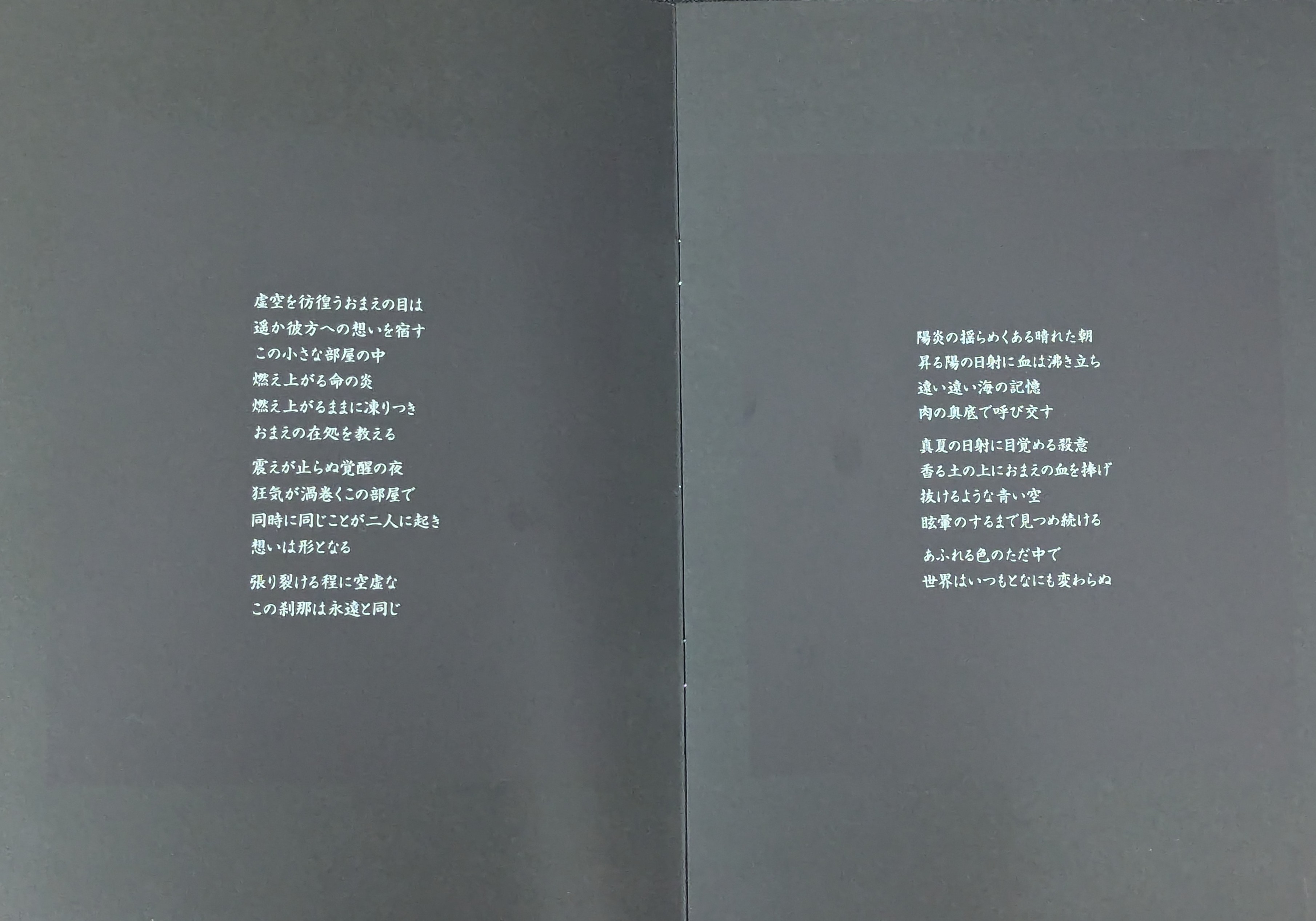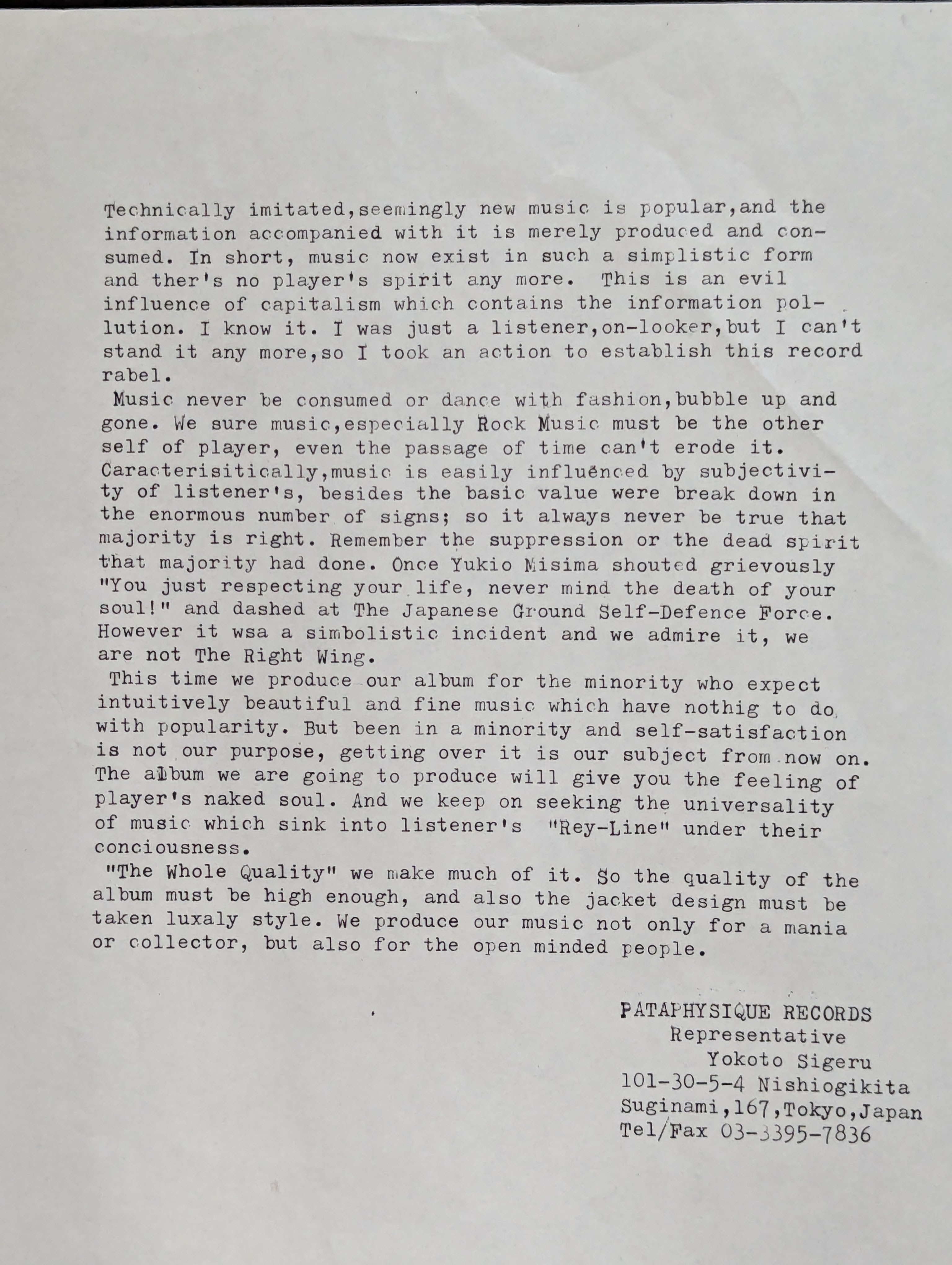 At first glance, the black on black worn sleeve feels heavy, but pretty minimalist. It’s also a near identical inverse of the first LP. A glance inside though, and there is a heavy duty black on black insert with all of the lyrics in a really nice minimalist package, an insert with song titles and credits (if you can send me a copy, please do I need it), and an additional insert we will talk about in a minute. The lyrics are abstract and poetic, fitting the mood of the basic rock riffs with super fuzzed out guitars and drifting out into fuzzy psychedelic noisy bliss. Gone is the synthesizer sound from the first album and now onto basic 2 and 3 chord rock and roll songs soaring into fuzzed out chaos. One of Creature’s all time faves. But now, the promised insert. It’s a statement from Pataphysique Representative (which I assume must be the band/Fukuoka Rinji) with a strong statement about their vision and the reason for the elaborate packaging, all limited to 200 copies again. They cite as inspiration words from the ultra-nationalist Yukio Misima (who performed seppuku after leading an attempted coup to restore the emperor), while being adamant they are not the right wing. Kinda wild to think about that with the ultra-nationalist fascist piss babies currently throwing a white nationalist temper tantrum here in the US. Anyway, no right wing sounds herein and I take it as them admiring the symbolism in standing up to current majority. A beautiful, fucked up sounding record that I love.