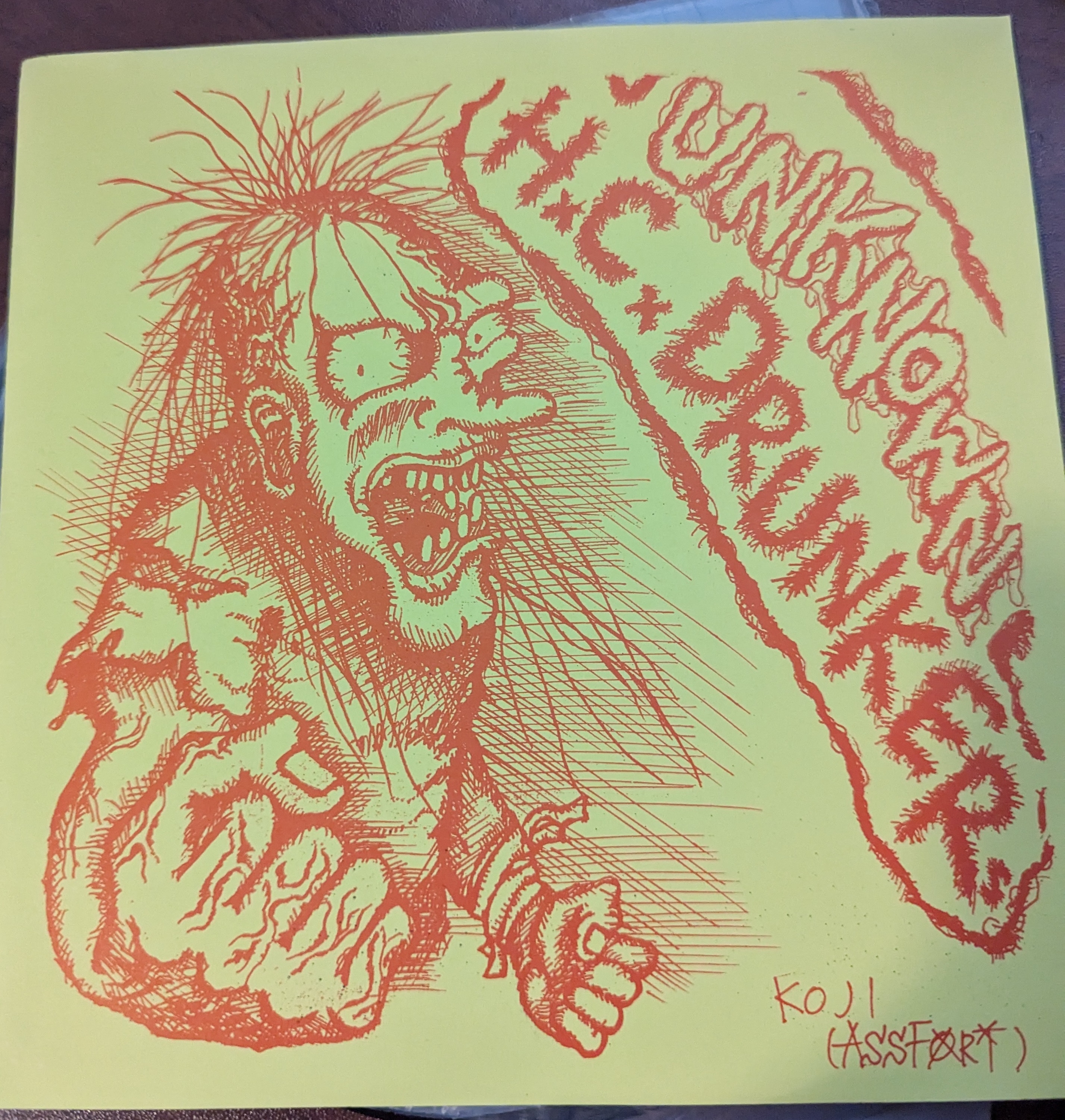 Next up, I grabbed this triple (!!!) flexi comp on MCR records of Japanese hc called Unknown H.C. Drunkers (link).