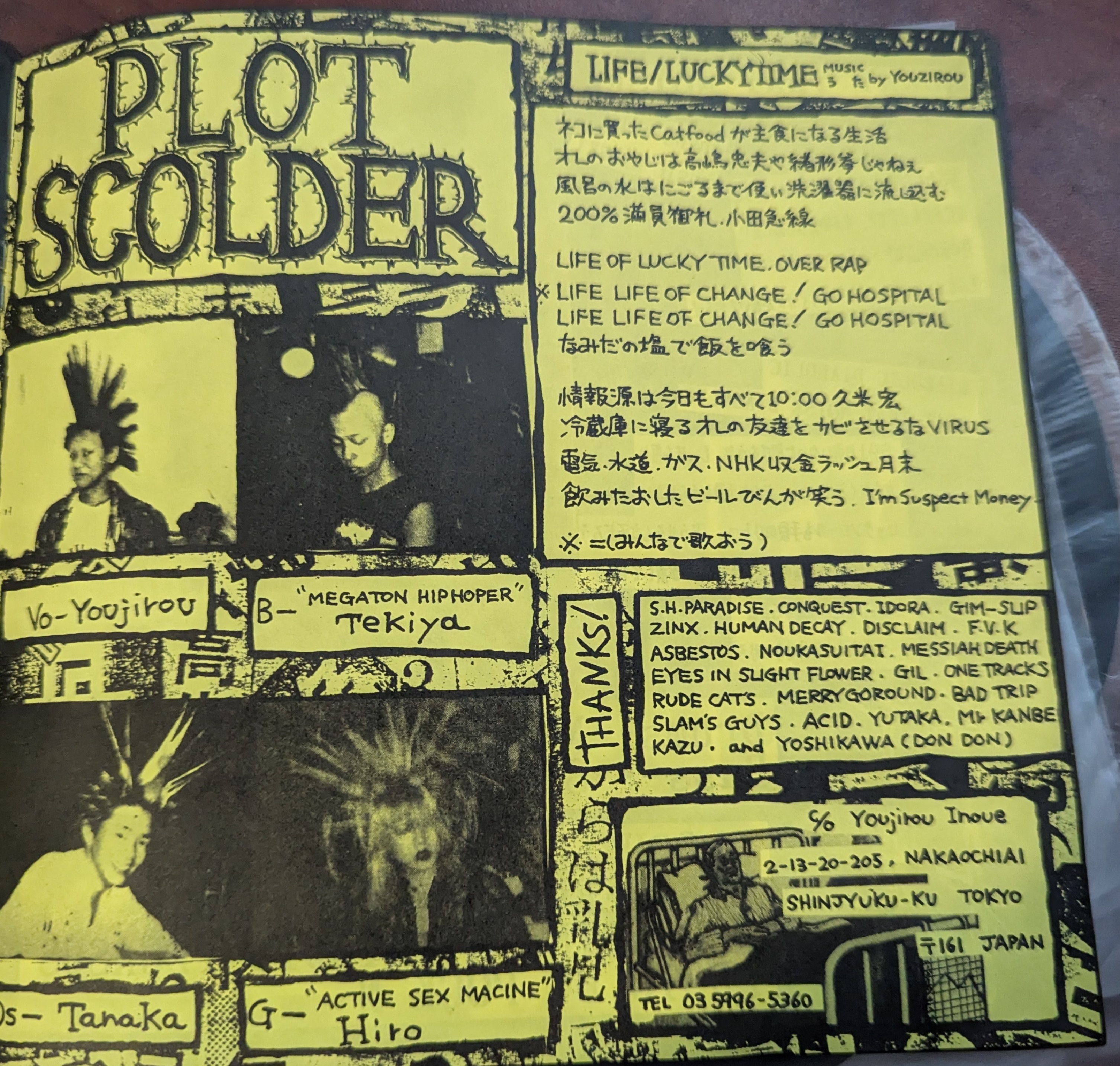 While the cheap price and cover art by a member of Assfort sold me instantly, when I got this home and looked at the 7" booklet cover with individual band pages I knew this was gonna be good. Never heard of them before but Plot Scolder from Tokyo have incredible punk hair and some amazing nicknames. “Megaton Hiphoper” on bass and “Active Sex Macine” on guitar. So many cool bands on the thanks lists too. Of course it is ripping, heavy hardcore and a fun comp overall. Most of the bands were apparently unknown then and this appears to be the only release for a lot of them. I love punks and punk.