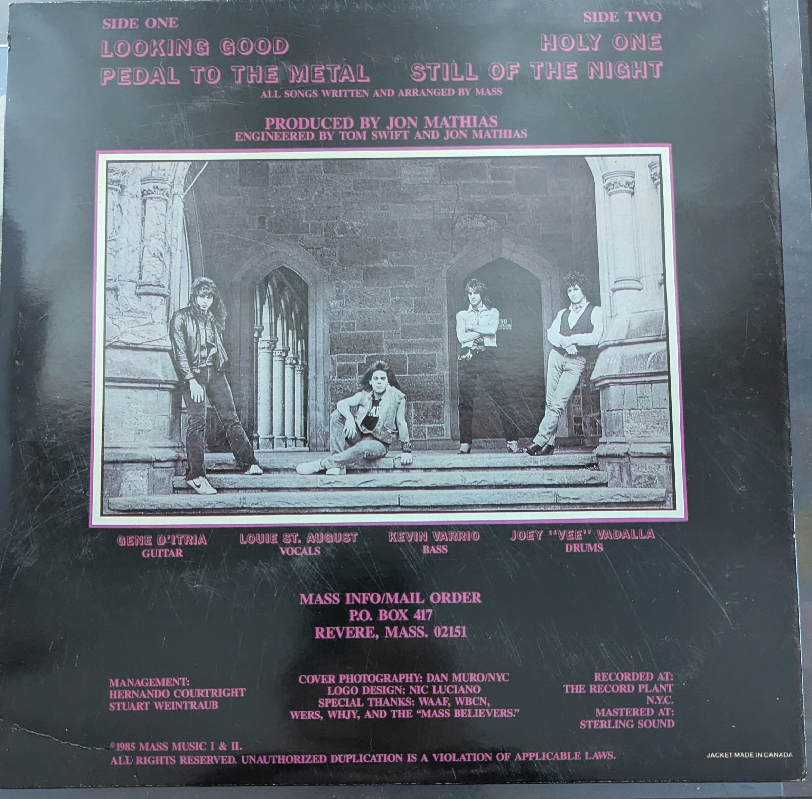 Up first, grabbed a private press looking metal 12" from Mass. Self titled and self released, I saw it at an antiques mall and grabbed it immediately based upon the Star Trek anus looking logo, the apparent self release, being from Revere, calling your fans "mass believers", the 5 dollar price tag and most importantly, look at the band photo. Fuck. Is it good, depends on your tolerance for metal bands looking to make it big. This is all over the place stylistically. I dig the doomier sounds on the b-side, but the vocals are a little too-Cinderella for me. At least I have a nice gift for a buddy more into this sound than me. Love finding this kinda nonsense in the wild.