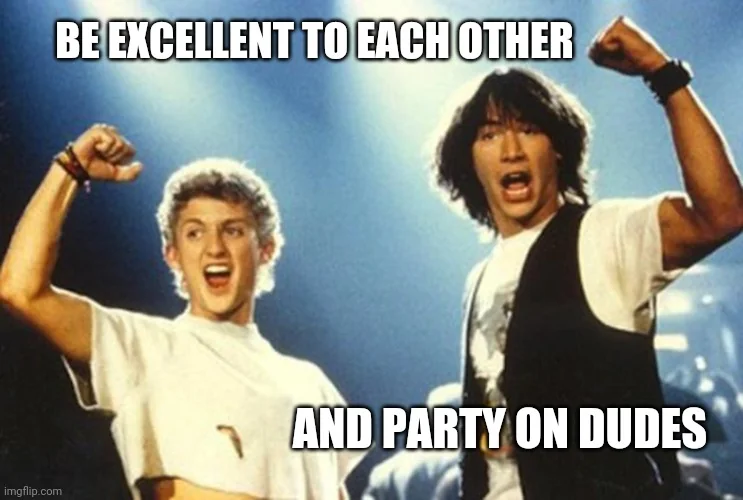 True that, dudes. Salutations, fellow Wasteland Chicks. Welcome back to a brand new W.C. double feature, and instead of music, we’re reviewing MOVIES! And today we’ll be reviewing the classic “Bill and Ted’s Excellent Adventure”, which I give a nine out of ten. The plot is both funny, heartfelt, and low-stakes, which I enjoy, as movies need stakes, but when they’re amped up too high, it can be a stressful watch. Something I also enjoy is how all of the characters (sans a few) are just nice and friendly to each other: Bill and Ted are great friends and are sweet and accommodating to the time travel people they bring back for their report, the time travel dudes are nice to each other despite being from different time periods and some friendships are even struck up, and even the slight antagonist teacher is surprisingly friendly to the about-to-fail Bill and Ted. Also something cute I noticed: the birthday balloon Deacon (Ted’s little brother) has in his room says “Party on Dude!” on it, meaning that Ted got him the balloon! Aww! Also, shoutout to Socrates for just literally going along with everything in this movie despite being kidnapped from Ancient Greece by two 20th century high schoolers. Like, this dude literally saw the future and did not care! Also, the final report scene is excellent, as it shows the crowd loving it, and the time travel people showing off their skills, and Bill and Ted just being Bill and Ted. Also, who is doing that incredible lighting? Nikola Tesla in a booth? Anyway, I also love Bill’s stepmom, Missy, who is really sweet, and Napoleon being a dick. It’s just pretty funny to watch! Also-also, I love how B&T meet the future and its people and learn that their music (which gets better trust) helped positively change the world. Maybe we need to send a Bill and a Ted on an Excellent Adventure. We could use one! Anyway, I give this movie a 9 out of ten, as it’s low-stakes yet enjoyable, the characters are nice and hilarious, and the movie itself is just a feel-good, funny, Excellent Adventure. Maybe I’ll review the rest of the series…Only time and hyperfixations will tell…. Make sure to party on, fellow Wasteland Chicks. Bye!